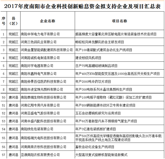 根據(jù)市工信委、市科技局、市財(cái)政局《關(guān)于申報(bào)2017年度南陽(yáng)市企業(yè)科技創(chuàng)新貼息資金的通知》(宛工信聯(lián)〔2018114號(hào))的相關(guān)要求,依照《2017年度南陽(yáng)市財(cái)政支持企業(yè)科技創(chuàng)新貼息項(xiàng)目資金評(píng)審辦法》,20181010日—12日,市工信委、市科技局、市財(cái)政局共同組織專家對(duì)企業(yè)申報(bào)材料進(jìn)行了評(píng)審,根據(jù)專家評(píng)審意見(jiàn),經(jīng)研究,現(xiàn)將擬支持的71家企業(yè)共計(jì)71個(gè)項(xiàng)目予以公示。歡迎社會(huì)各界參與監(jiān)督,如有異議,請(qǐng)以電話或書面形式向市工信委、市科技局、市財(cái)政局反映。