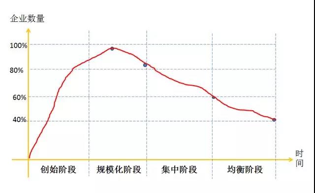 在一個(gè)行業(yè),從長期看,企業(yè)要存活下來就要有超出平均水平的成本控制能力。管理學(xué)家陳春花認(rèn)為一個(gè)行業(yè)內(nèi)企業(yè)數(shù)量和時(shí)間軸之間的關(guān)系可以通過四個(gè)發(fā)展階段來說明:初創(chuàng)階段、規(guī)?;A段企業(yè)數(shù)量一直上升,規(guī)?;笃谄髽I(yè)數(shù)量達(dá)到頂峰,開始有擠出效應(yīng),約20%企業(yè)出局,到集中階段又有20%企業(yè)出局,到均衡階段還要淘汰20%,最后的競爭就在剩下的40%企業(yè)之間展開。